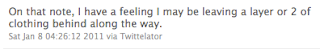 Wonder Woman Underoos, a thermal top, running shirt my mom gave me, the official half-marathon shirt, a red mickey mouse sweatshirt, my Lose for Good sweatshirt, My Slytherin scarf, my owl hat and a pair of gloves. I felt a little like Ralphie's brother Randy from A Christmas Story: